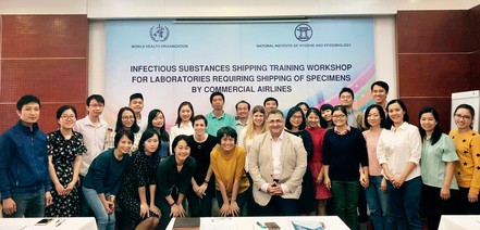 Lớp tập huấn vận chuyển các chất lây nhiễm qua đường h àng không cho cán bộ xét nghiệm các viện VSDT, viện Pasteur khu vực, CDC các tỉnh, bệnh viện có liên quan.