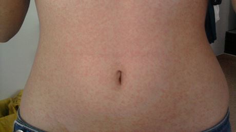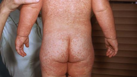 - Triệu chứng toàn phát: kéo dài 2-5 ngày, bé hết sốt, bắt đầu phát ban, hồng ban dạng sẩn, khi căng da thì ban biến mất, xuất hiện từ sau tai, sau gáy, trán, mặt, cổ lan dần đến thân mình và tứ chi, cả lòng bàn tay và bàn chân.