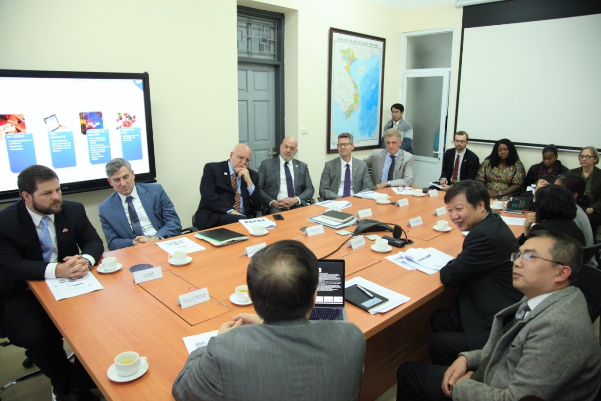 Cuộc gặp mặt được tổ chức tại Văn phòng Đáp ứng khẩn cấp phòng chống dịch bệnh (EOC) của Viện Vệ sinh dịch tễ Trung ương – nơi được hỗ trợ xây dựng và vận hành bởi CDC năm 2016. PGS.TS Trần Như Dương và PGS.TS Lê Thị Quỳnh Mai – Phó Viện trưởng thay mặt cho Ban giám đốc Viện để tiếp đoàn.