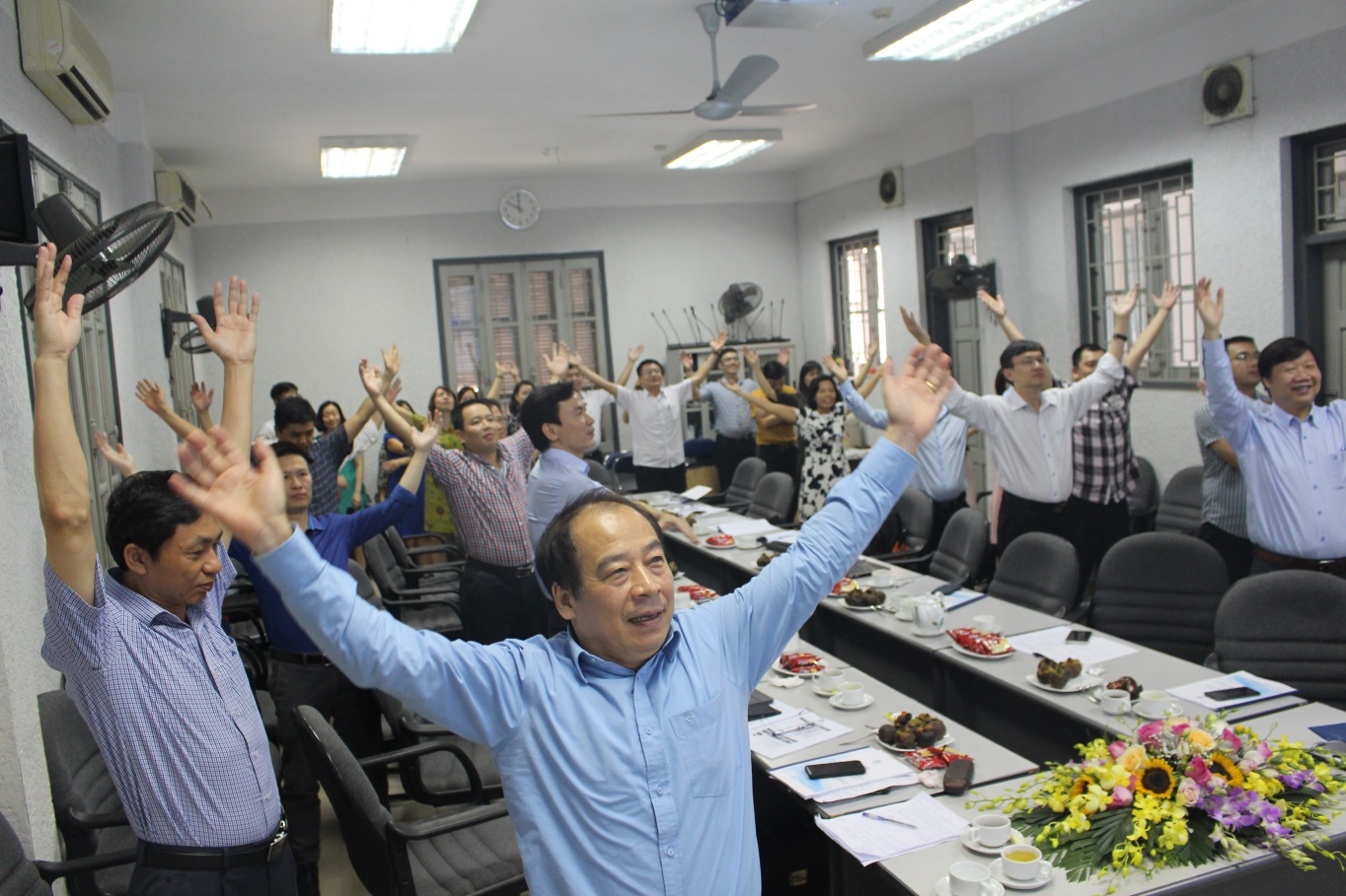 Các đại biểu tập thể dục trong giờ nghỉ giải lao