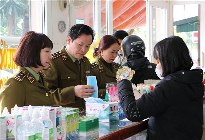 Đội Quản lý thị trường số 2, Cục Quản lý thị trường kiểm tra cửa hàng kinh doanh trang thiết bị y tế Nhà thuốc Sơn Huyền, phường Đông Phong thành phố Lai Châu nơi có bán mặt hàng khẩu trang không niêm yết giá và tăng giá. Ảnh: Quý Trung/TTXVN