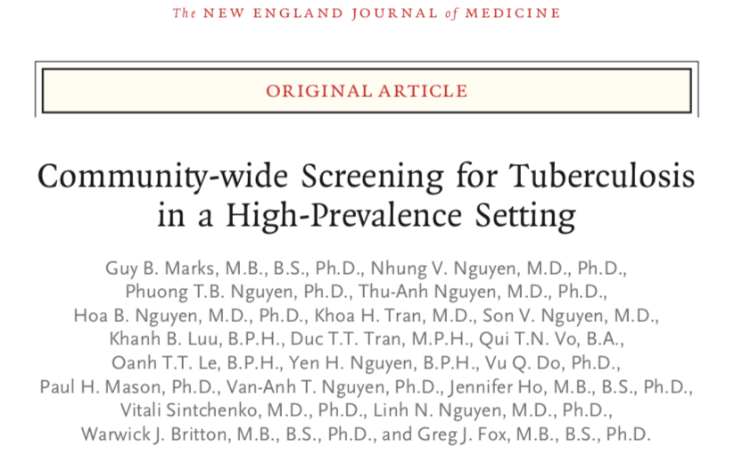 Bài báo “Community-wide Screening for Tuberculosis in a High-Prevalence Setting” công bố ngày 2 tháng 10 năm 2019 trên Tạp chí NEJM, cho thấy sàng lọc lao toàn bộ cộng đồng hàng năm ở khu vực lưu hành bệnh lao cao hiệu quả hơn phát hiện ca bệnh thụ động theo thường quy của Chương trình Chống lao Quốc gia, trong việc giảm tỷ lệ lưu hành. Nghiên cứu cho thấy việc đạt được tốc độ giảm cần thiết bằng các công cụ hiện có để chạm mục tiêu kết thúc bệnh lao là có thể - nếu huy động được các nguồn lực nhanh chóng và đầy đủ.