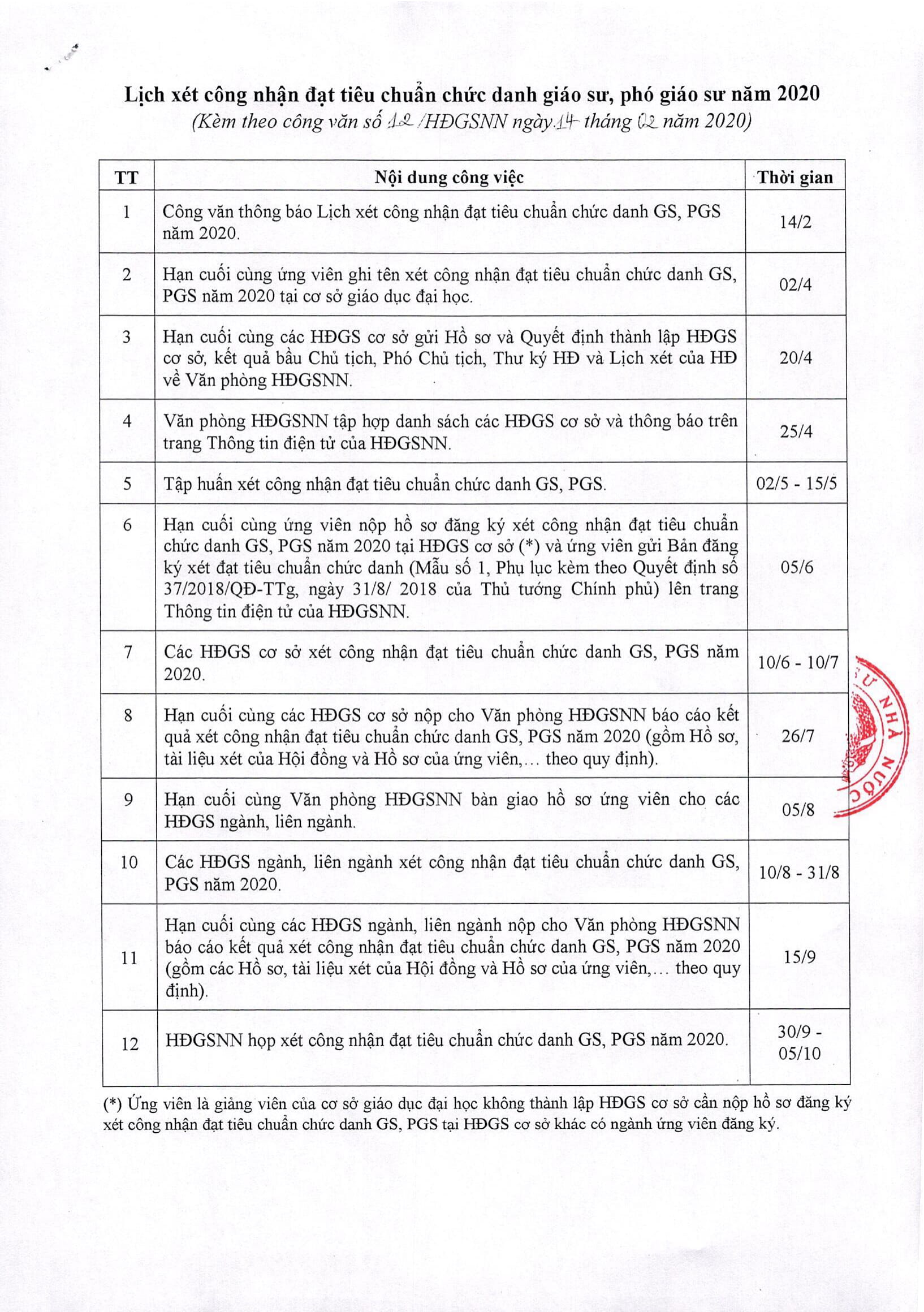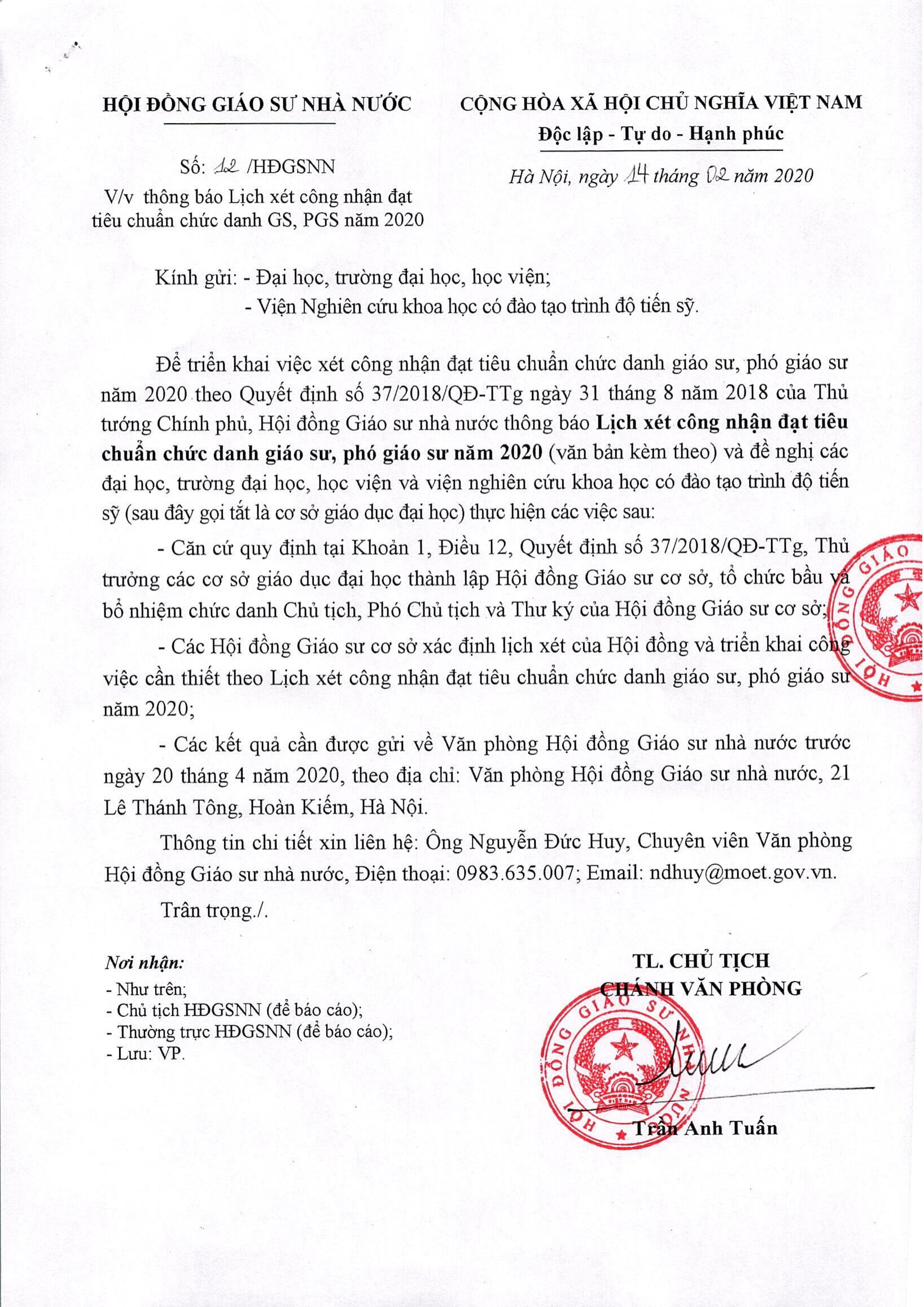 Để triển khai việc xét công nhận đạt tiêu chuẩn chức danh giáo sư, phó giáo sư năm 2020 theo Quyết định số 37/2018/QĐ-TTg ngày 31 tháng 8 năm 2018 của Thủ tướng Chính phủ, Hội đồng Giáo sư Nhà nước thông báo Lịch xét công nhận đạt tiêu chuẩn chức danh GS, PGS năm 2020 (kèm văn bản chi tiết) và đề nghị các đại học, trường đại học, học viện và viện nghiên cứu khoa học có đào tạo trình độ tiến sĩ (sau đây gọi tắt là cơ sở giáo dục đại học) thực hiện các việc sau: