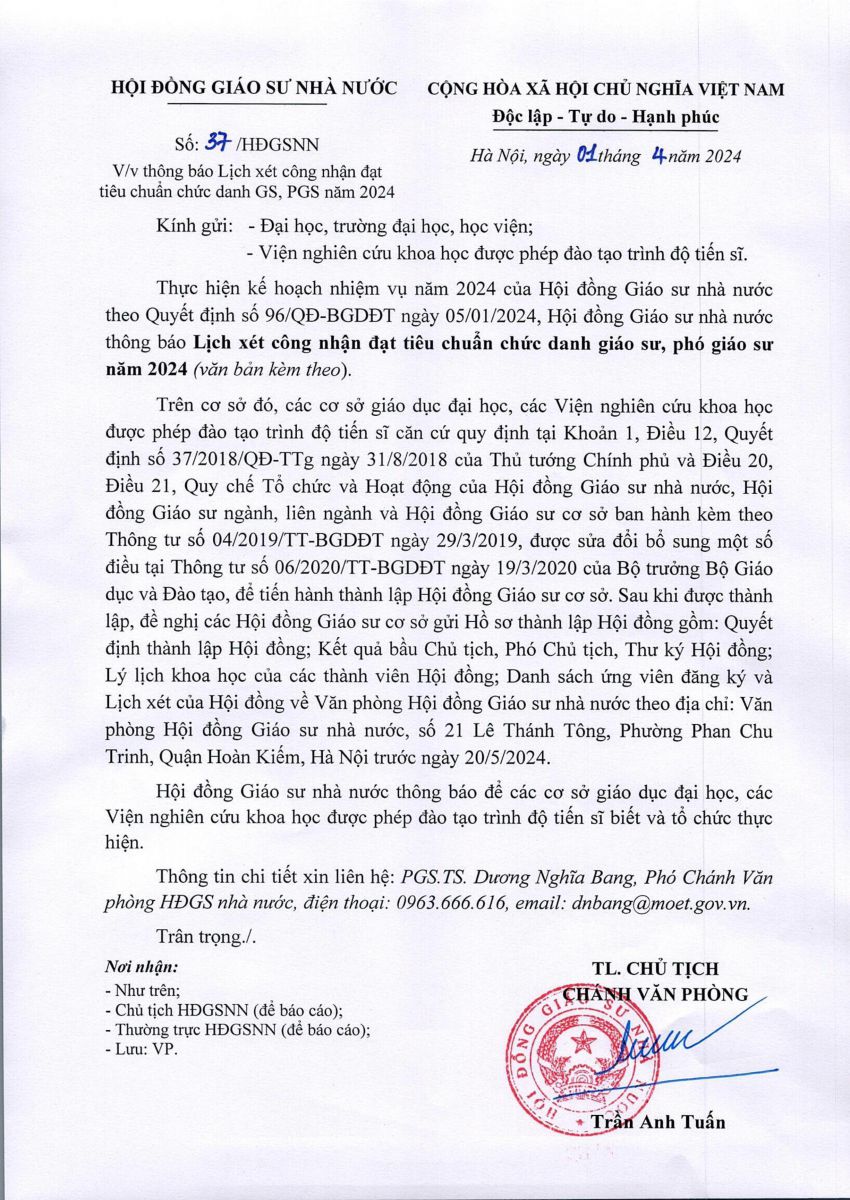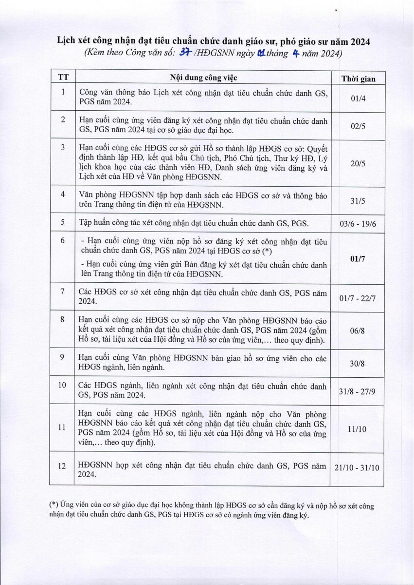 Hội đồng giáo sư nhà nước thông báo Lịch xét công nhận đạt tiêu chuẩn chức danh GS, PGS năm 2024 trong công văn 37/HĐGSNN ngày 01/04/2024 (văn bản chi tiết đính kèm).