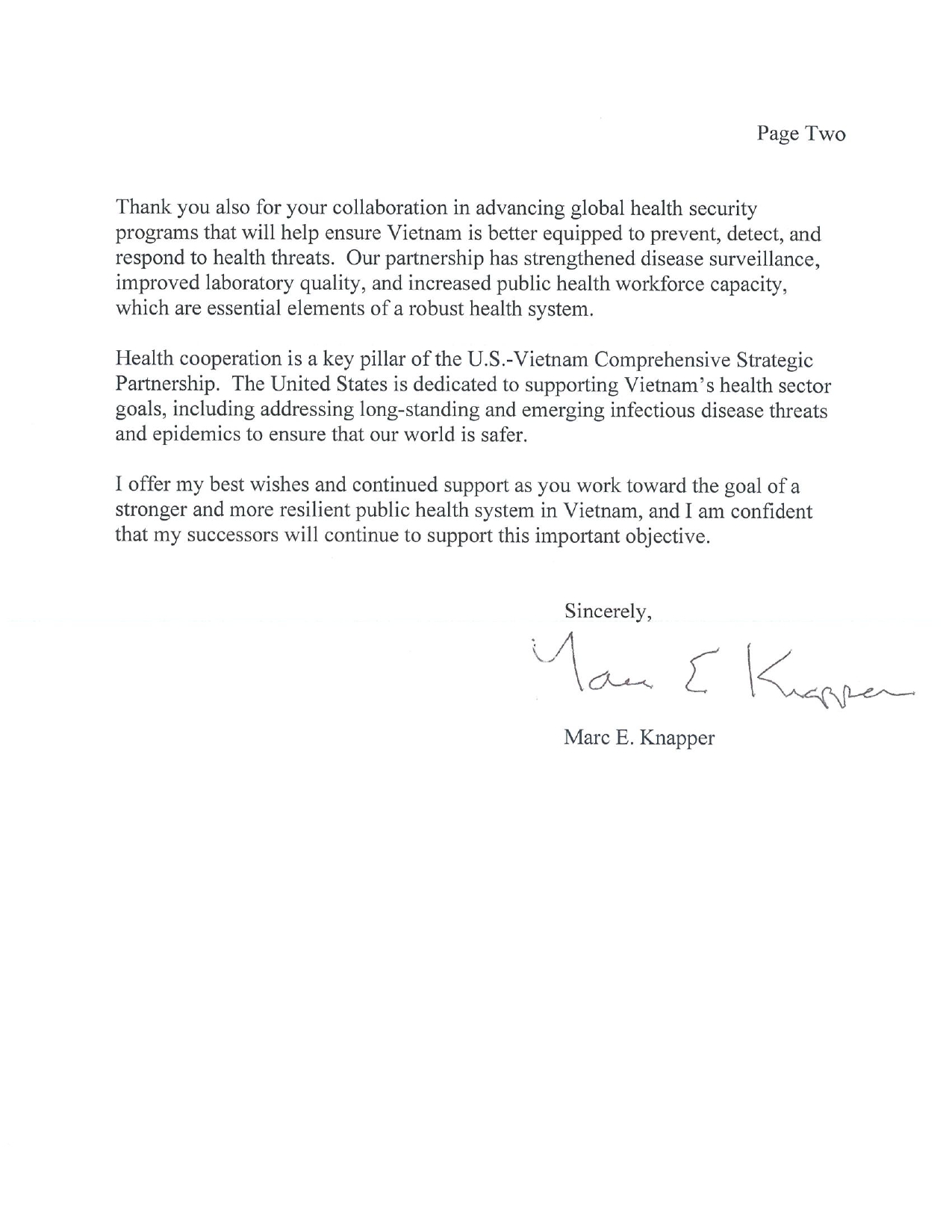 Ông cũng đánh giá cao sự hợp tác trong lĩnh vực an ninh y tế toàn cầu, góp phần nâng cao năng lực giám sát dịch bệnh, xét nghiệm và nguồn nhân lực y tế công cộng. Cuối cùng, ông khẳng định hợp tác y tế là trụ cột quan trọng của quan hệ đối tác chiến lược toàn diện Hoa Kỳ - Việt Nam và cam kết tiếp tục đồng hành cùng Việt Nam trong xây dựng một hệ thống y tế công cộng vững mạnh, kiên cường.